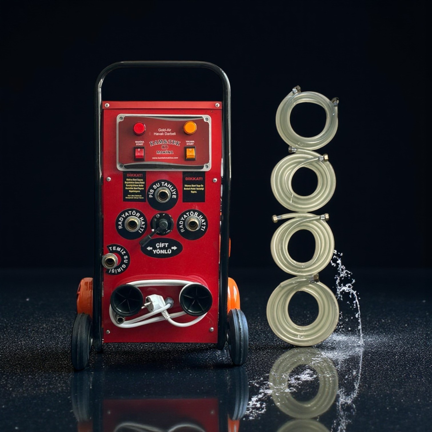 Gold-Air Petek Temizleme Makinesi, ısıtma ve tesisat sistemindeki, çamur, kireç, pas artıklarını basınçlı temiz su kullanarak çok hızlı bir şekilde temizleyen bir makinedir. Sadece bir temizleme işlemi sonrasında, kombinin optimum enerji verimlilik oranını ve genel ısıtma sistem performansını en yüksek seviyeye çıkarır; kombi gürültüsünü ortadan kaldırır ve yakıt tüketimini en aza indirerek enerji verimliliğini sağlar. %100 Yerli Üretim olduğundan yedek parça temini kolaydır. Ergonomik yapısı ve şık görünümüyle profesyonel bir makinedir.